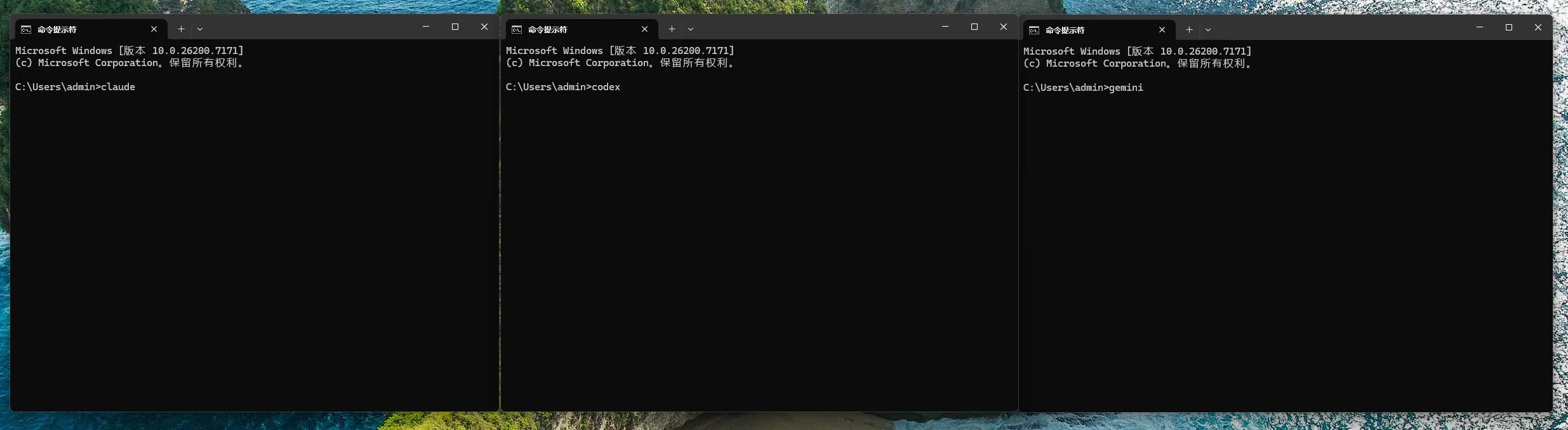 打开三个终端,分别运行Claude Code、Codex、Gemini的CLI,如果有界面,说明没有问题了,不需要管其他的报错!